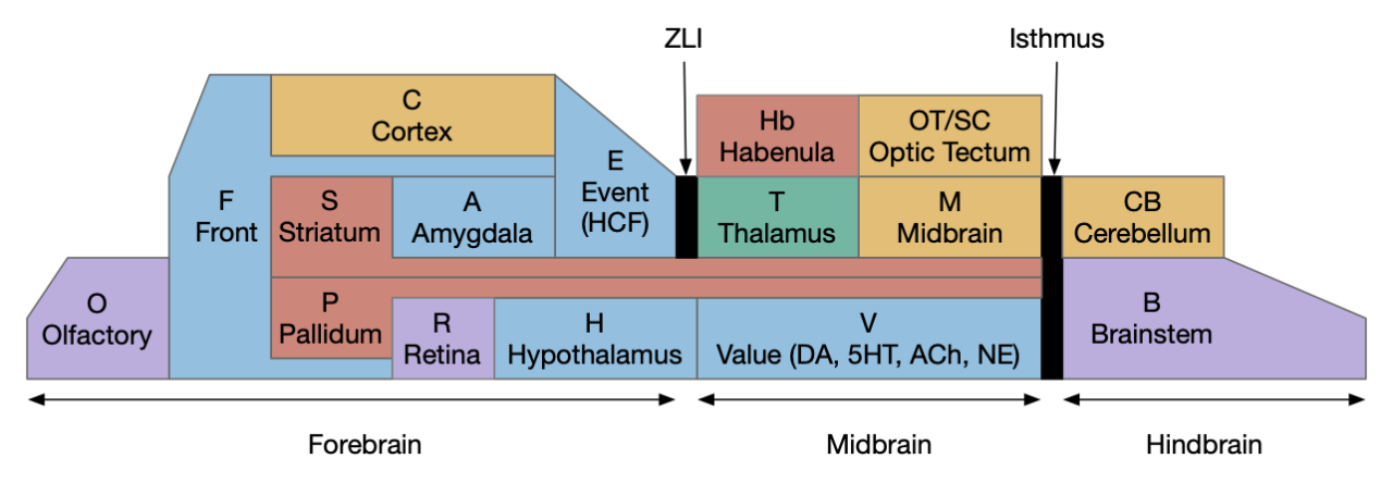 As a simplified example of decision making, the acoustic startle reflect and the hindbrain Mauthner cells in fish. There are two Mauthner cells in R4 (hindbrain rhombomere 4), one on each side. This startle reflex is a very fast (20ms) three-synapse circuit to escape danger. A loud sound drives acoustic sense neurons, which drives the ipsilateral Mauthner cell, which drives contralateral motor neurons to quickly turn in a “C-start” before swimming away [Bátora et al 2021]. This simple circuit is essentially a Braitenberg vehicle [Braitenberg 1984]. The Mauthner cells can also be driven by touch, vestibular, or by OT, and in zebrafish larvae, the head touch connections develop first, before the acoustic inputs [Kohashi et al 2021].